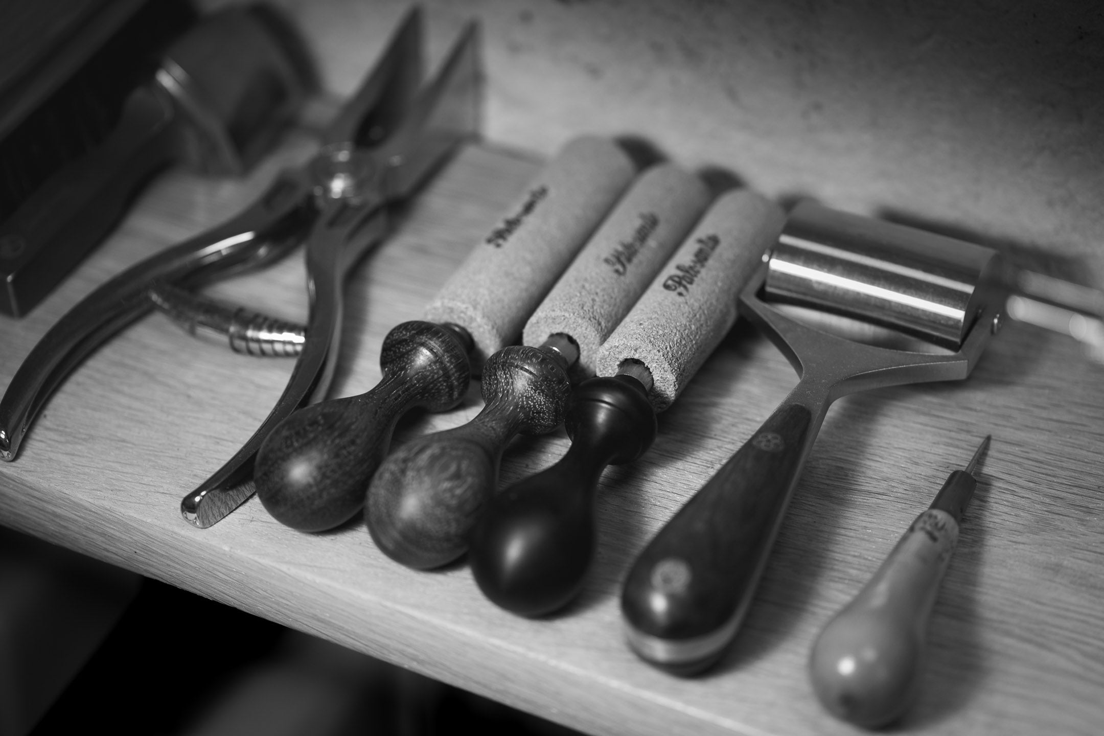Deux compétences indispensables à l'artisan maroquinier qui doit veiller à ce que l'ensemble de ses outils soient affûtés en permanence pour avoir un tranchant permettant de réaliser un travail propre et précis, qu'il s'agisse du parage comme des découpes.